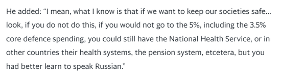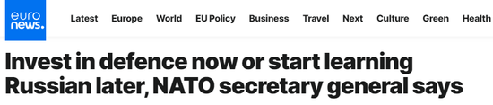 吕特说:“如果你们不(把军事化支出)提高到5%,包括3.5%的核心国防开支,你们仍然可以保留医疗系统、养老金系统等等,但你们最好学会说俄语。”